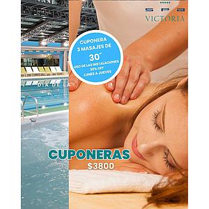 Cuponeras de 3 masajes de 30 minutos, con uso de instalaciones para utilizar de lunes a jueves.